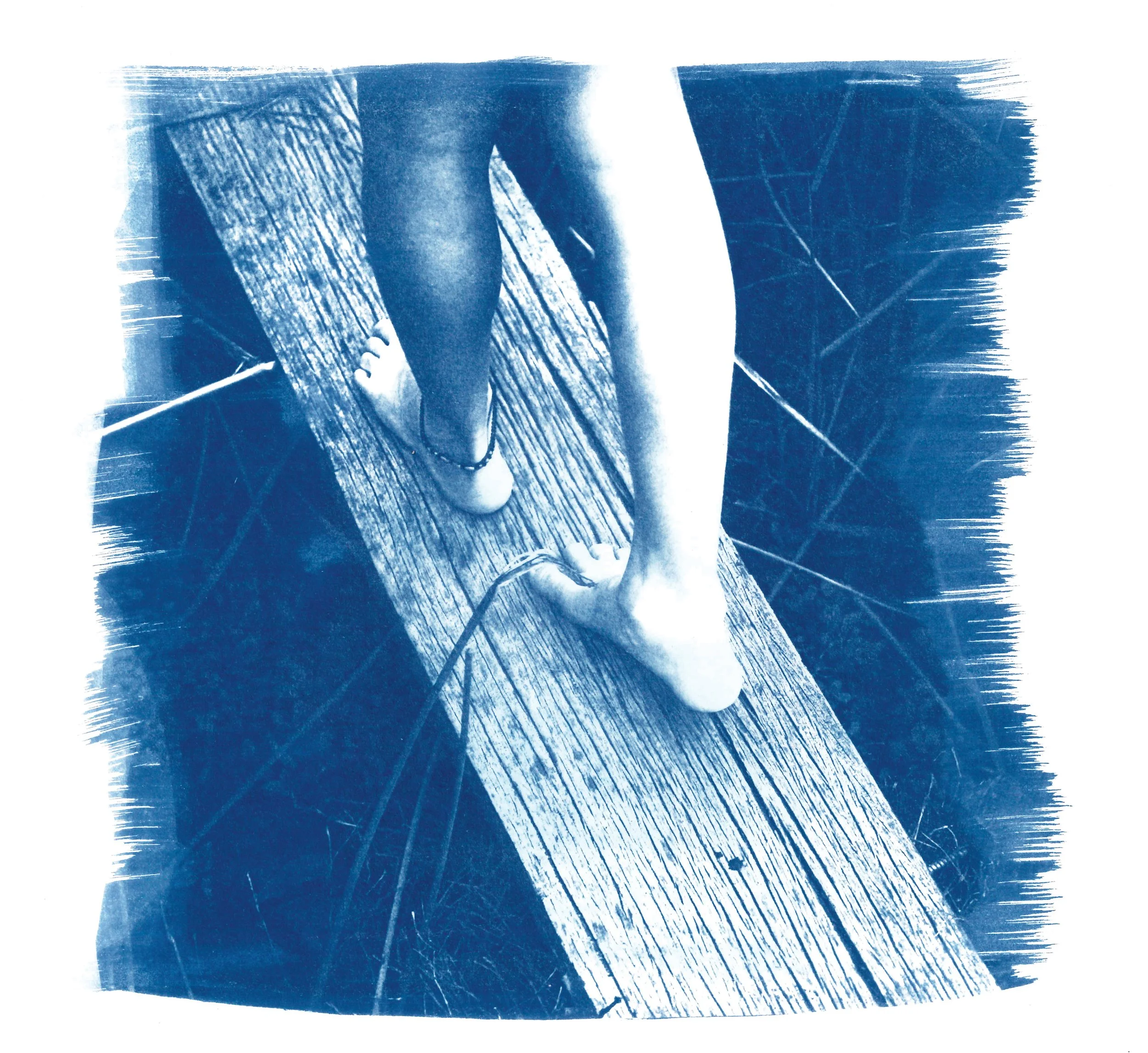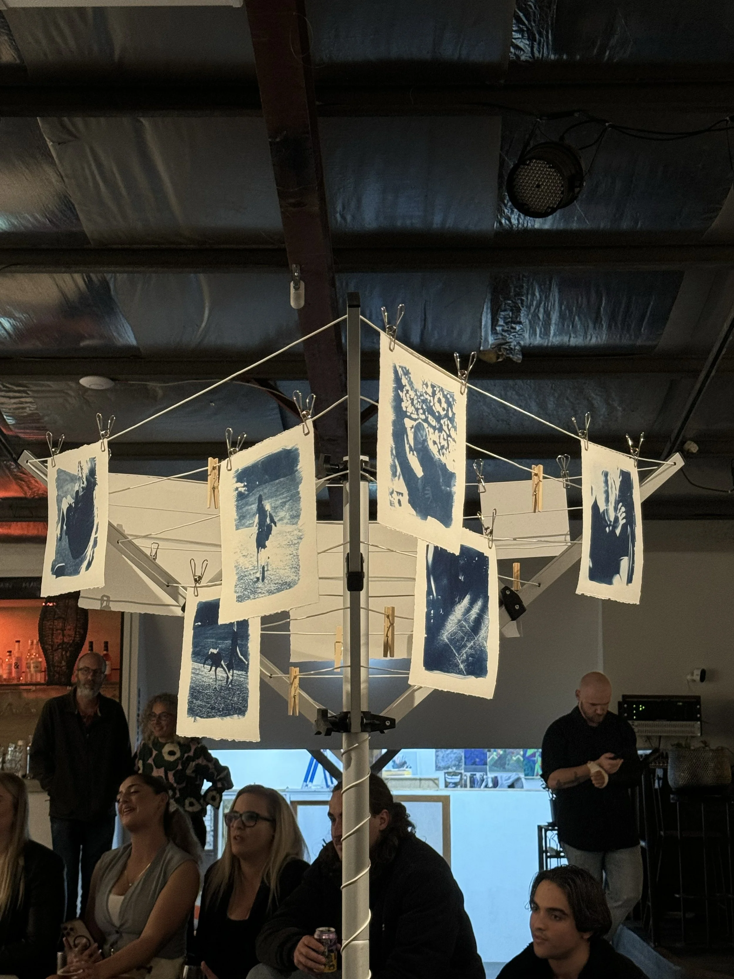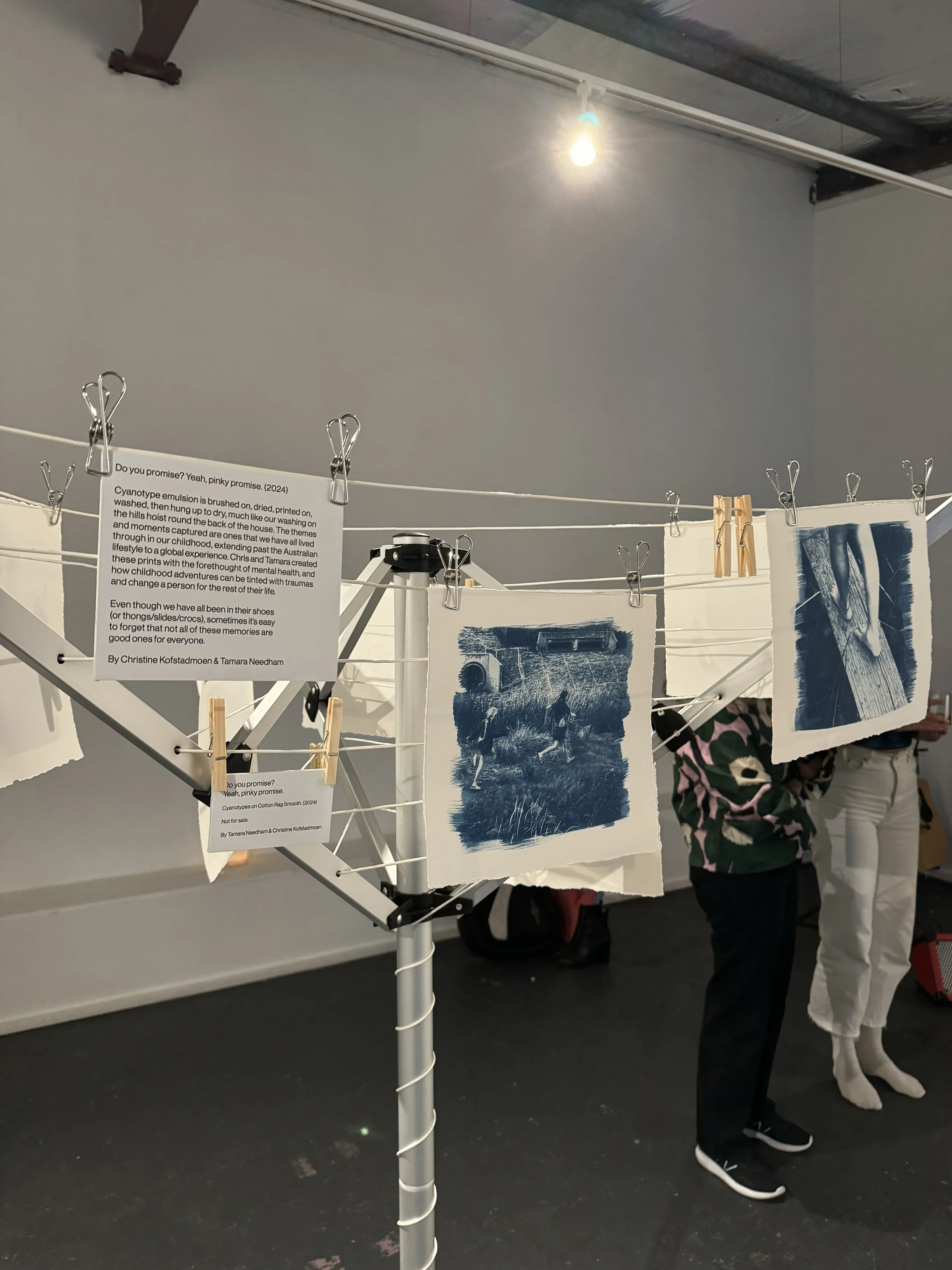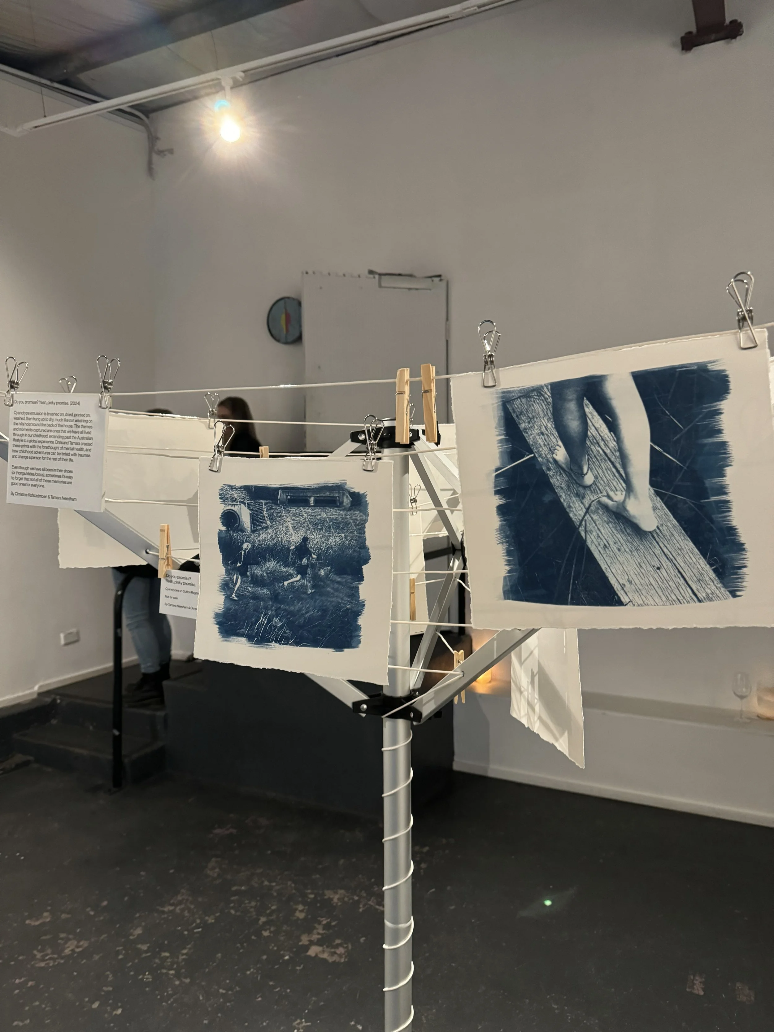 Cyanotype emulsion is brushed on, dried, printed on, washed, then hung up to dry, much like our washing on the hills hoist round the back of the house. The themes and moments captured are ones that we have all lived through in our childhood, extending past the Australian lifestyle to a global experience. Christine and Tamara created there prints with the forethought of mental health, and how childhood adventures can be tinted with traumas and change a person for the rest of their life.